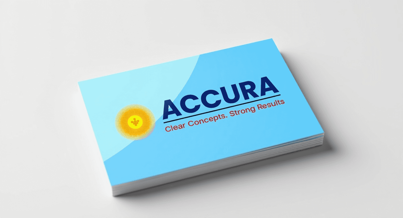 We developed a distinctive sun-inspired logo, featuring geometric rays radiating from a central core to symbolize clarity, enlightenment, and focused energy. The vibrant yellow-orange gradient conveys warmth and optimism, complemented by bold navy blue typography for the word ACCURA, which adds a sense of professionalism and stability. The tagline “Clear Concepts. Strong Results” is rendered in striking red, reinforcing the brand’s confident, results-oriented approach. The overall identity achieves a perfect balance between warmth and professionalism, making it both memorable and trustworthy across all touchpoints.
